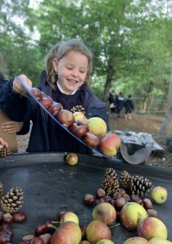 In the afternoon, creativity bloomed as they used conkers to make stick people, complete with braided wool hair. Over in the mud kitchen, some delicious (pretend!) autumn soup was cooked up using twigs, leaves, and lots of imagination. One of the highlights of the day was racing autumn fruits down the big tubes – laughter and cheers filled the forest!
